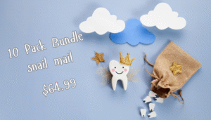 10 unique letters with 10 personalized envelopes! With this kit you will receive a tooth pouch for your child so they don’t lose their tooth in the bed, or worse, never budge an inch off that pillow so you can’t possibly get the tooth out! With your pouch you will never miss another tooth again. Little surprises are included with your letter, so if you choose NOT to pay for teeth this letter is a wonderful alternative in itself with nothing else needed. If you choose to add a dollar or two then having your letter and envelope will make sure not even coins will get lost in transition!